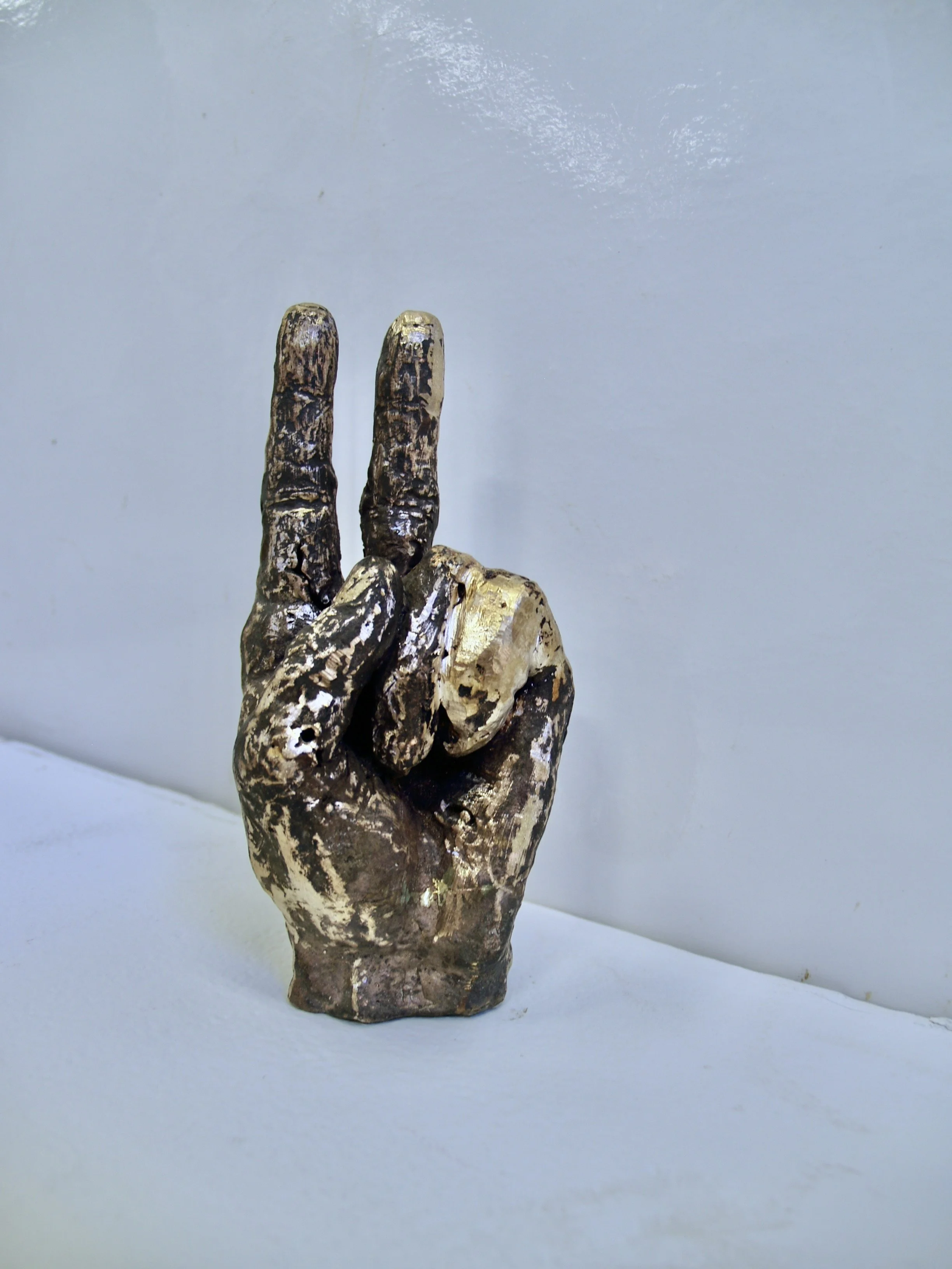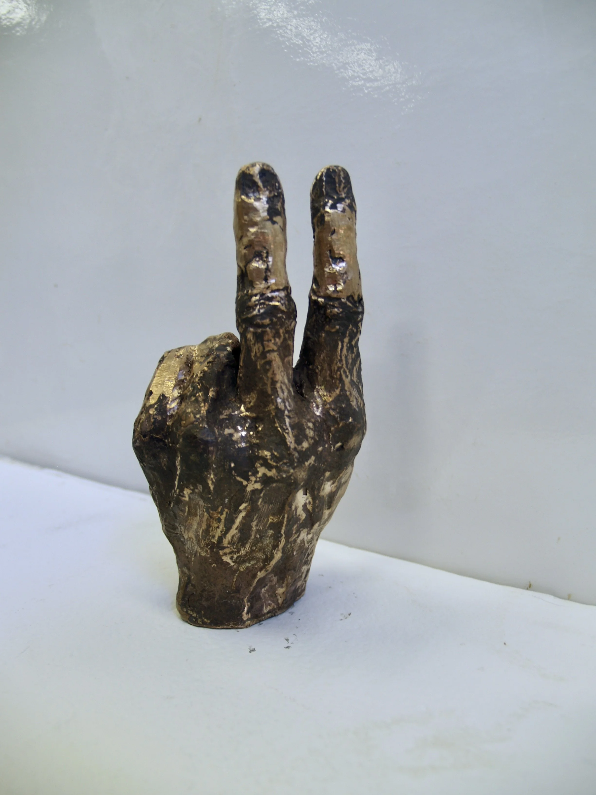 In one direction this sculpture symbolizes peace, turned 180 degrees it communicates insult. This project is about exploring gesture, visual communication and the often subtle complexities that create impactful resistance.