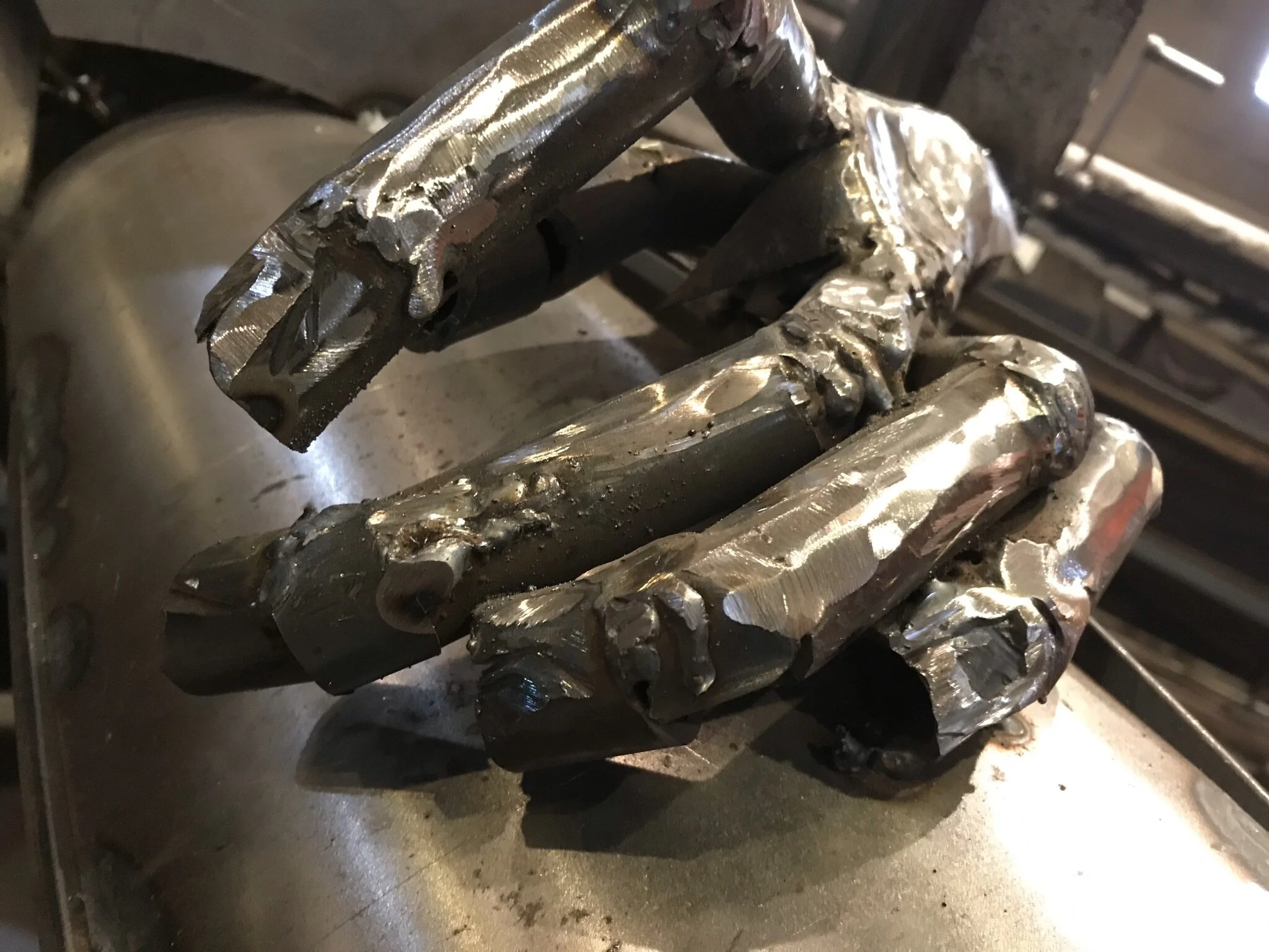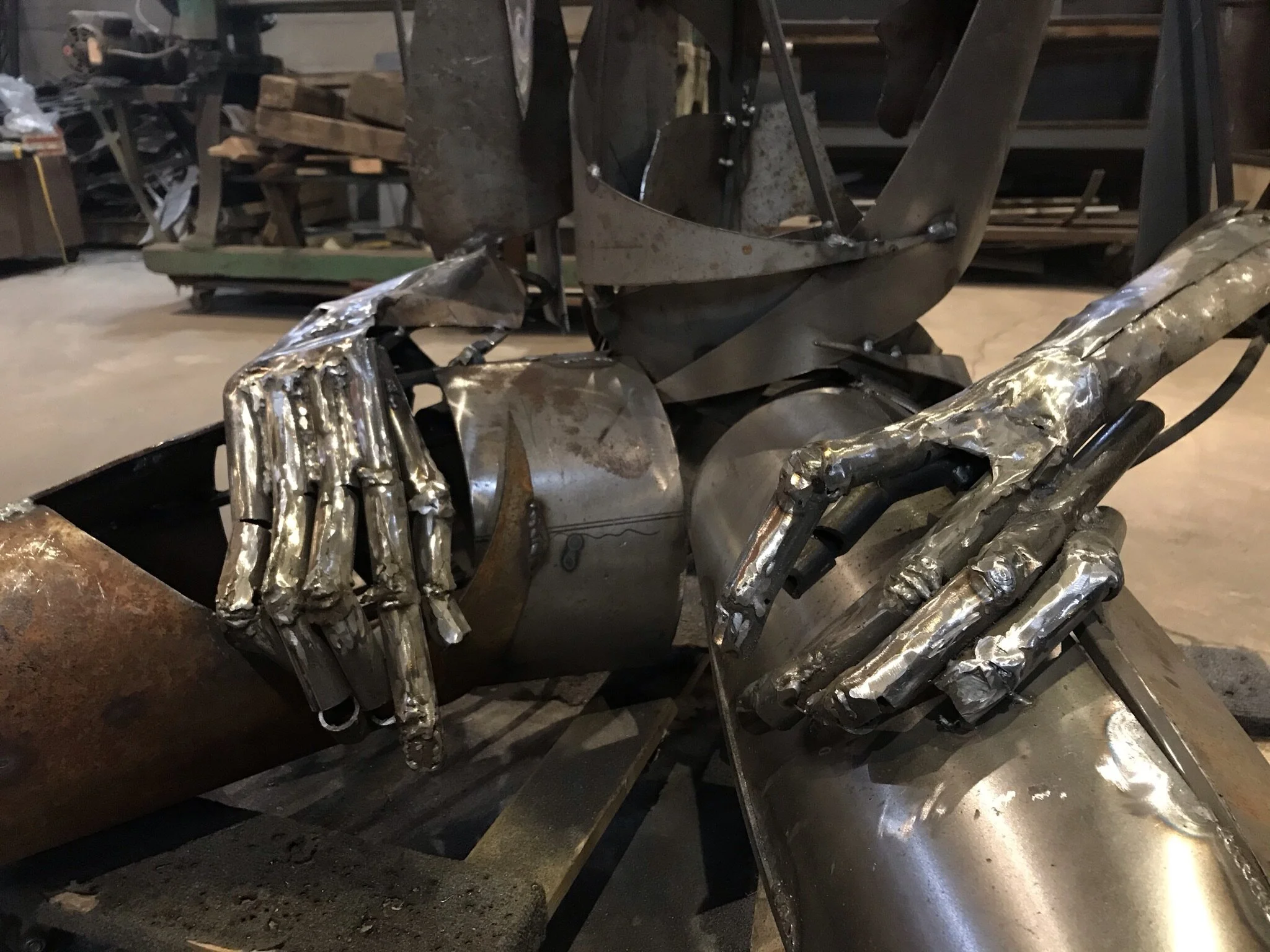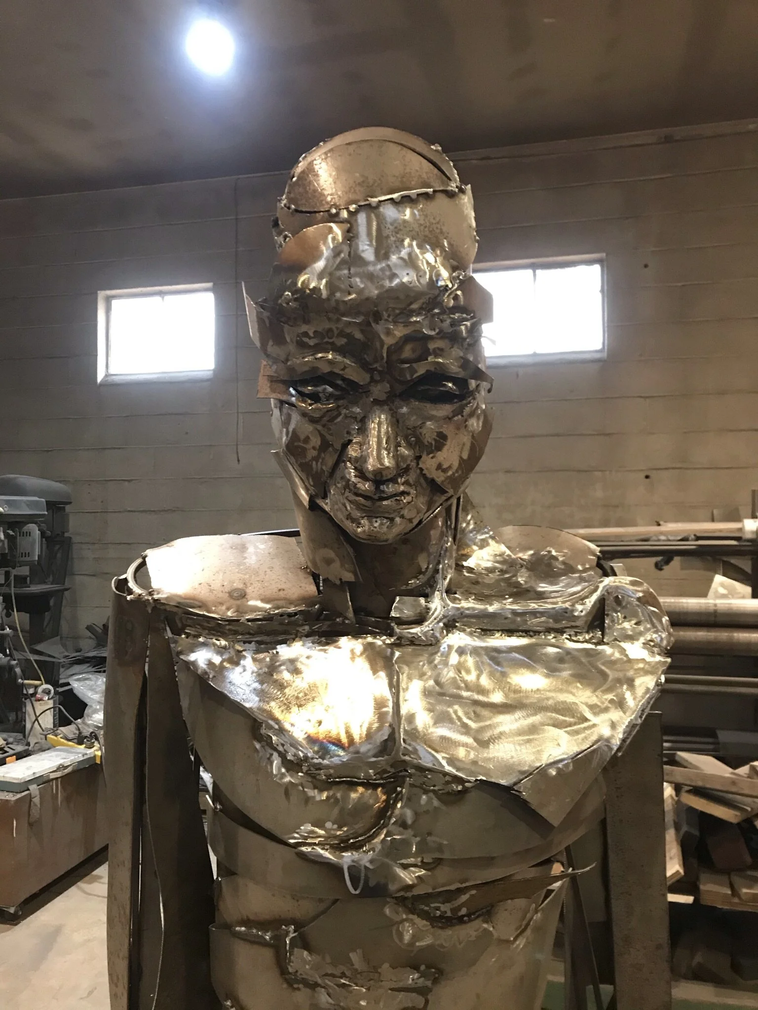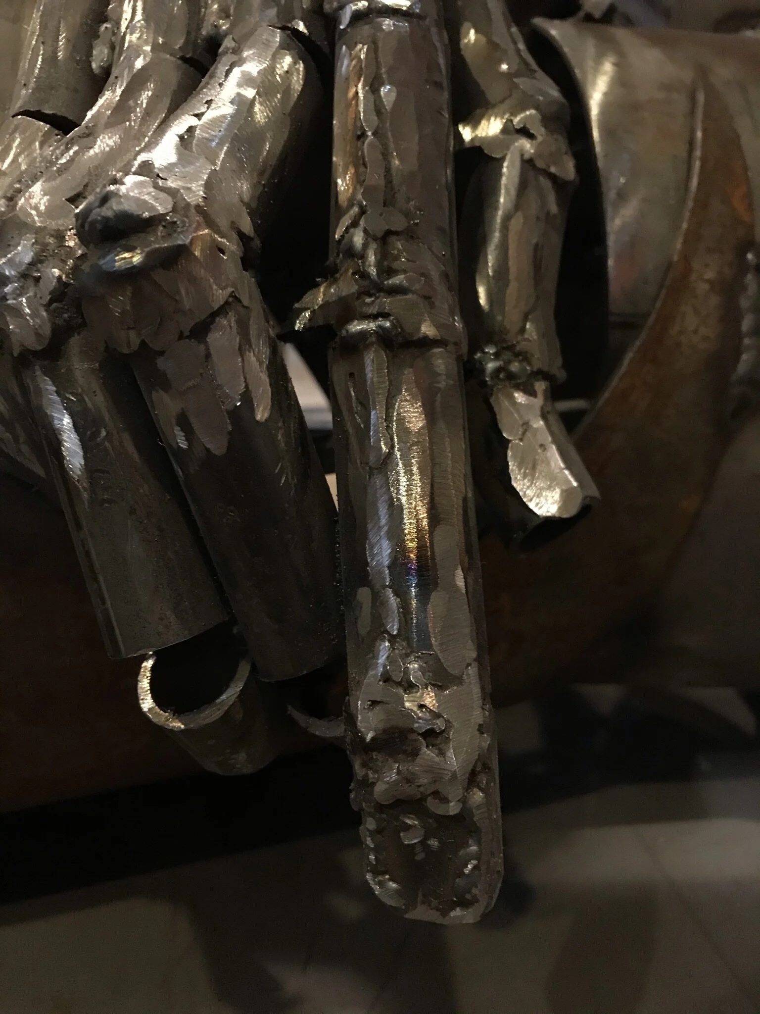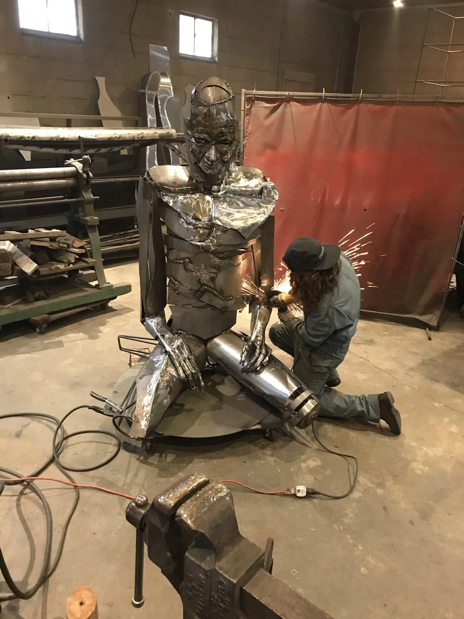 Scrap steel puzzled together to construct a welded figure. This large-scale, outdoor sculpture explores the experience of putting oneself back together after heartbreak and grief using a Buddhist concept originated by Roshi Joan Halifax. She describes it as follows: “... If we strengthen our back...and develop a spine that’s flexible but sturdy, then we can risk having a front that’s soft and open, representing choiceless compassion. The place in your body where these two meet—strong back and soft front—is the brave, tender ground in which to root our caring deeply.” The sculpture is meant to rust and decay with time.